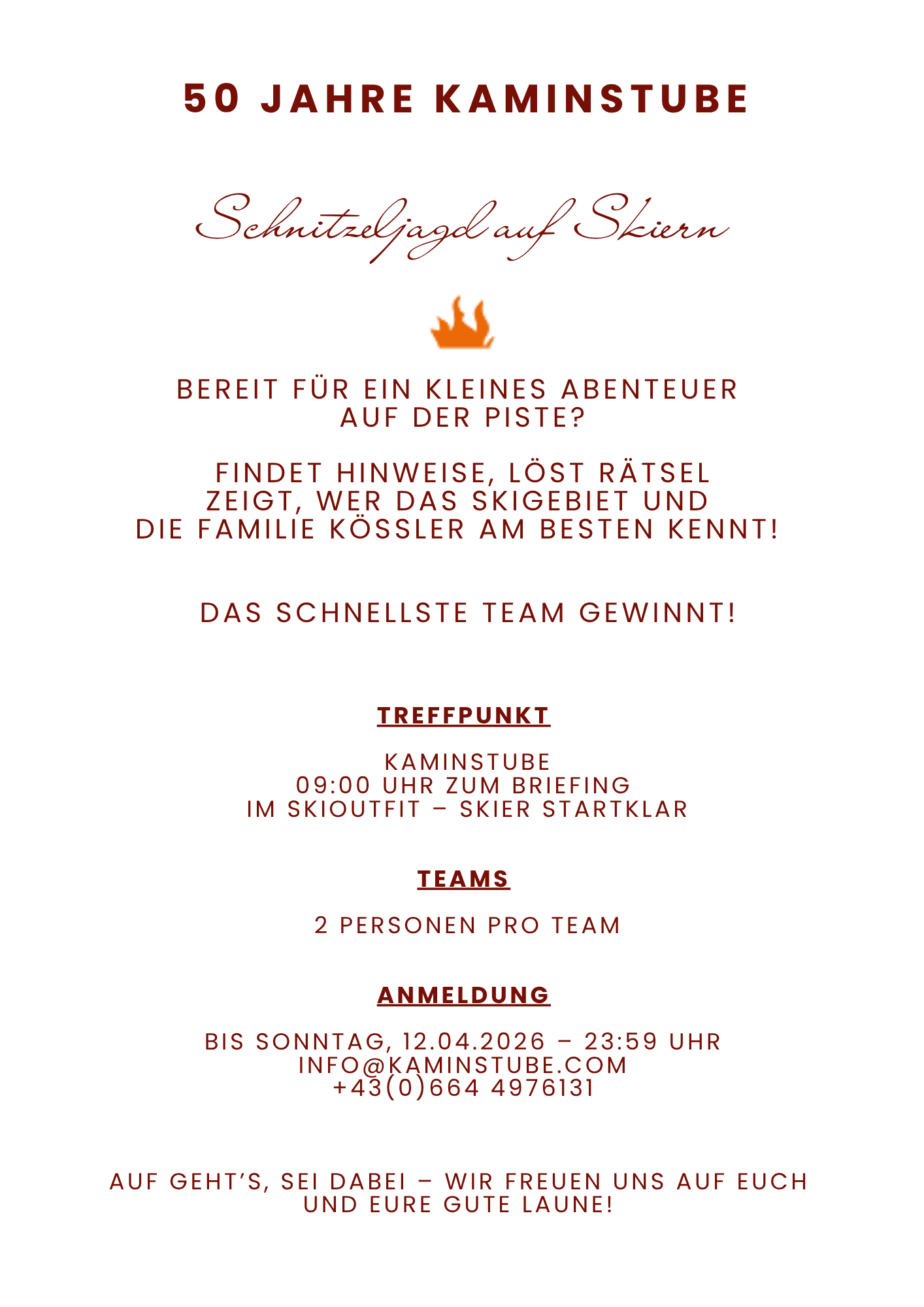 Diesen Meilenstein feiern wir mit einem ganzen Wochenprogramm voller Highlights: Bewegung auf der Piste, gemütliche Stunden beim Essen und gesellige Abende mit Musik. Ob Stammgäste oder neue Freunde des Hauses, alle sind eingeladen, dieses besondere Jubiläum mit uns zu feiern!